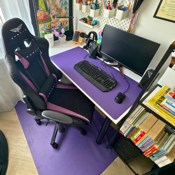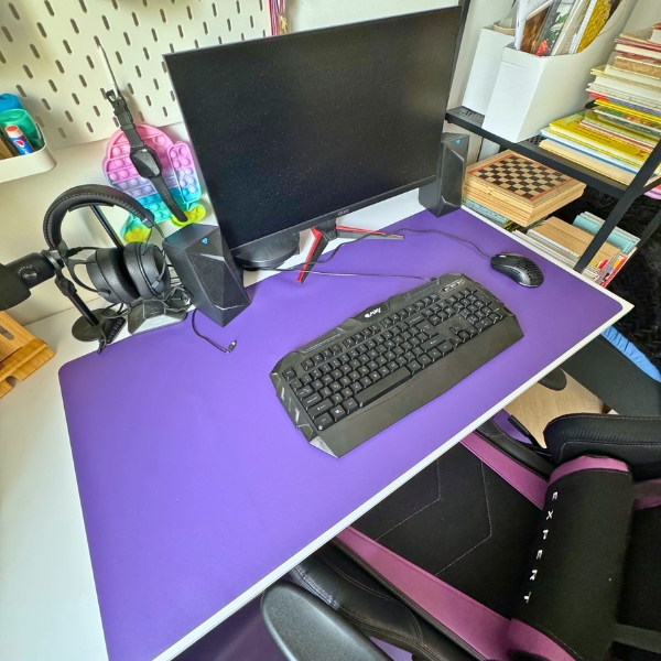 Veľká ochranná podložka na stôl tmavofialová ako doplnok kancelárskeho zariadenia interiéru povzbudí k práci a bude príjemným prekvapením a originálnym darčekom pre nového zamestnanca.